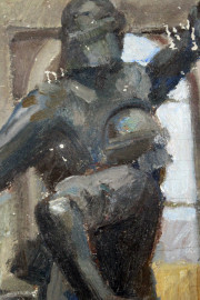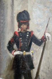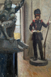 Interno di museo con divisa storica, olio su tavola, cm 46x37, firmato, (piccole cadute di colore)