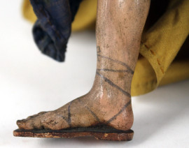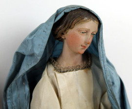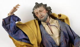 La Vergine e San Giuseppe, sculture da presepe in legno dipinto e tessuti ricamati, alt. cm 33, Napoli, XIX secolo, (difetti).