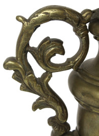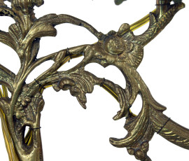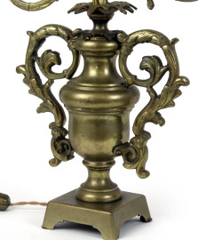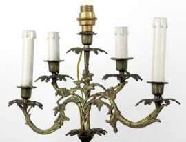 Lampada da tavolo in bronzo dorato, corpo a balaustro sormontato da cinque braccia a volute fogliacee, cm h 53, XX secolo