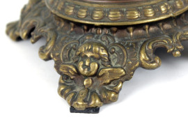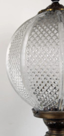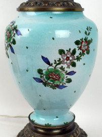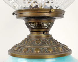 Lampada in porcellana policroma e metallo dorato, prima metà XX secolo, con decori floreali su fondo celeste, paralume in vetro controtagliato, cm h 67,