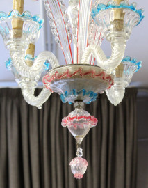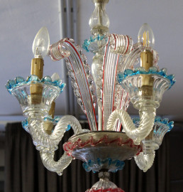Lampadario in vetro di Murano colorato, quattro braccia a volute intervallate da foglie curvate, cm h 70, XX secolo, (mancanze)