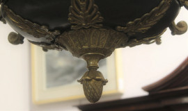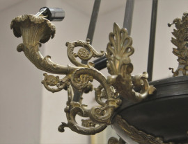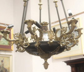 Lampadario stile Impero a sei luci, in bronzo dorato e patinato, cm h 114