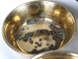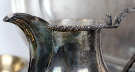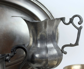 Lotto composto da tre versatoi, sette coppette ed un vassoio, in peltro e metallo argentato, alt. max cm 20, (difetti).