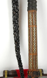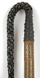 Lotto composto da un arco in legno con due frecce ed un frustino da cavallo celante al suo interno un punteruolo, corpo in legno intarsiato a motivi geometrici, impugnatura e frusta in pelle, lunghezza max cm 93, XX secolo, (difetti).