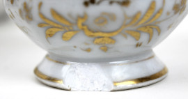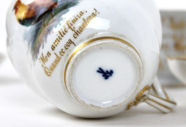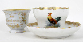Lotto composto da una tazza in porcellana policroma Meissen con decoro raffigurante gallo e motto "quand ce coq chantera mon amitié finira", ed una tazzina con piattino (non pertinente) in porcellana bianca con decori policromi e dorati, XIX secolo, (difetti)