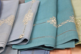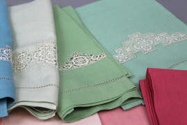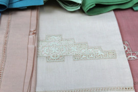 Lotto di 14 asciugamani in lino ricamato, colori diversi, prima metà XX secolo