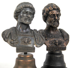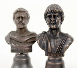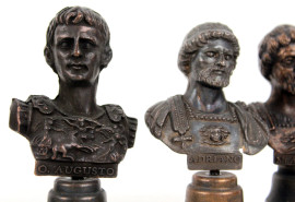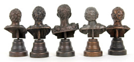 Lotto di cinque piccoli bustini in metallo brunito raffiguranti imperatori romani, XX secolo, alt. cm 10