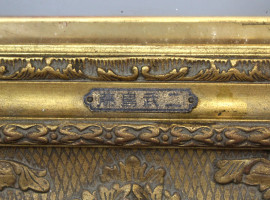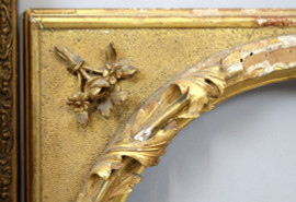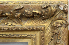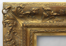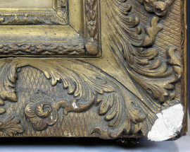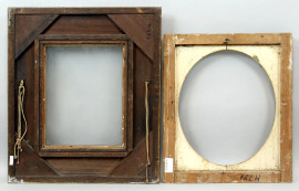 Lotto di due cornici di linea rettangolare e ovale in legno e stucco dorato, decori a motivi vegetali, misure max cm 70x57, (difetti).