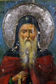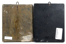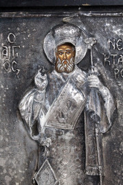 Lotto di due icone raffiguranti Sant'Antonio e San Nettario, olio su tavola con rizza e particolari in argento, scuola greca inizi XX secolo, (difetti)