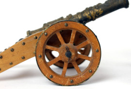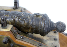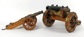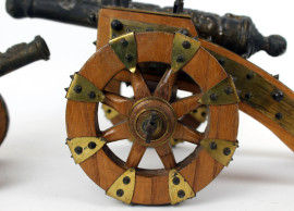 Lotto di due modellini di cannoni in bronzo, montati su base in legno, misure max cm 15x34x21, XX secolo.