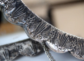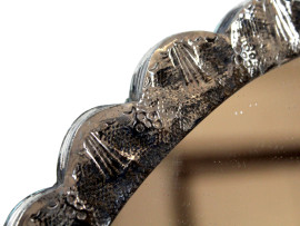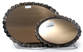 Lotto di due specchi ovali in metallo argentato sbalzato e cesellato a fiori e volute, bordo centinato, misure max cm 30x39, manifattura orientale, XX secolo