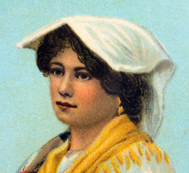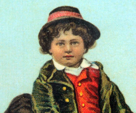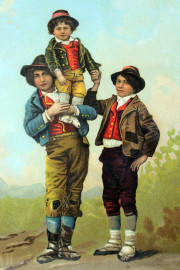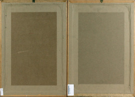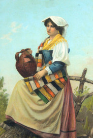 Lotto di due stampe colorate su cartoncino raffiguranti un'acquaiola e tre fanciulli, cm 44x29, inizi XX secolo, entro cornici.
