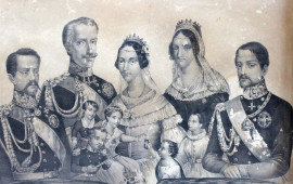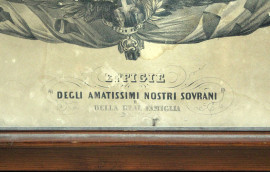 Lotto di due stampe del XIX secolo raffiguranti Ciceruacchio e la famiglia Savoia, misure max cm 40x53,5, entro cornici, (difetti)