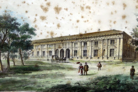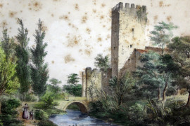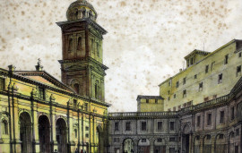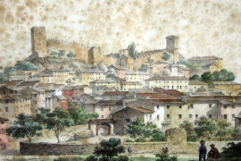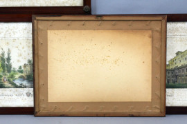 Lotto di quattro stampe colorate con vedute della città di Mantova, cm 32x42, XIX secolo, entro cornici, (difetti).