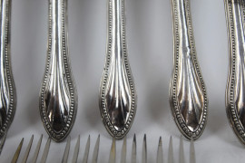Lotto di sei coltelli e cinque forchettine da dolce con manici in argento, prima metà XX secolo