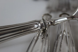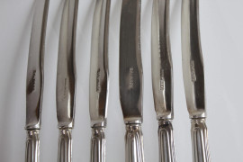 Lotto di sei forchettine e sei coltelli da dolce con manici in argento, metà XX secolo