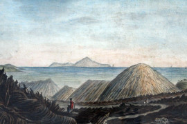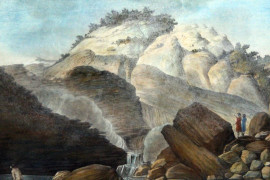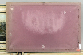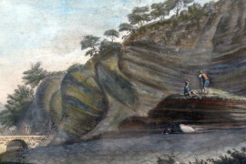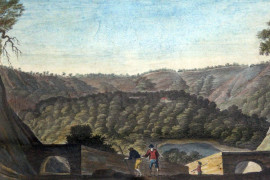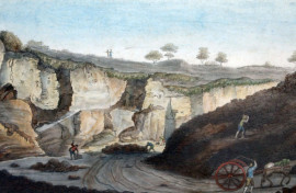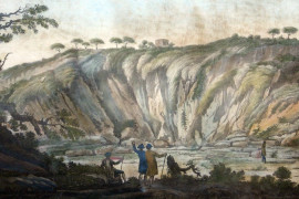 Lotto di sei stampe acquerellate raffiguranti paesaggi con gentiluomini e operai, cm 29,5x48, entro cornici.