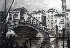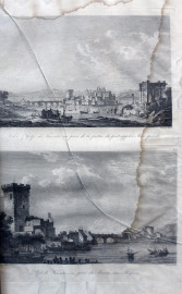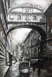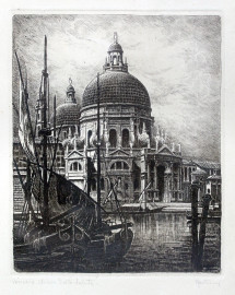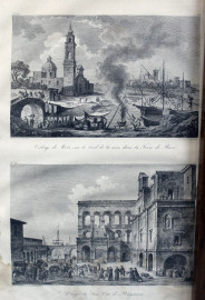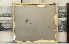 Lotto di sei stampe raffiguranti scorci di Venezia e paesaggi pugliesi, cm 52,5x35, XIX-XX secolo, entro cornici, (difetti e mancanze).