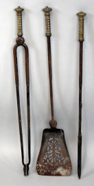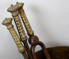 Lotto di tre attrezzi da camino ed un portaombrelli in ottone, altezza max cm 74