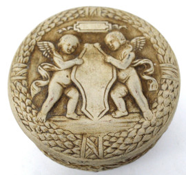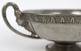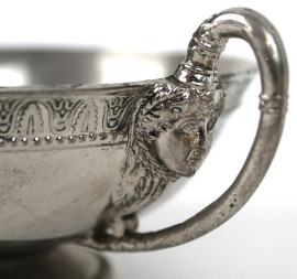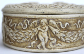 Lotto di un cofanetto cilindrico in ceramica ed un'alzatina in metallo argentato, altezza max cm 7