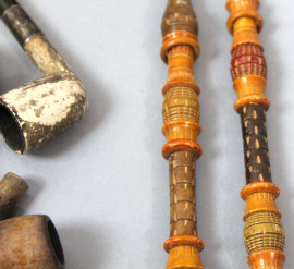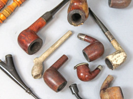 Lotto di undici pipe in legno e accessori vari, (difetti)