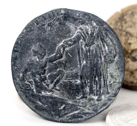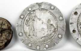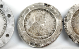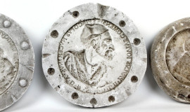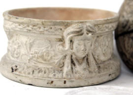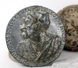 Lotto di vari calchi in gesso raffiguranti personaggi illustri, due medaglie in metallo con ritratto di Paolo Giovio vescovo di Nocera ed una scatolina in terracotta con decoro floreale e teste femminili, misure max cm 5x13, (difetti e mancanze).