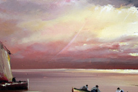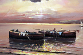 Marina con imbarcazioni al tramonto, olio su tela, cm 60x120, firmato, entro cornice