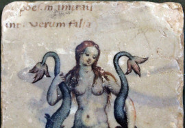 Mattonella raffigurante sirena bicaudata, cm 10x10, entro cornice