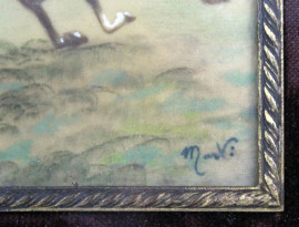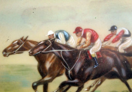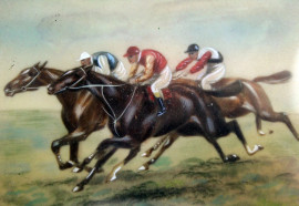 Miniatura raffigurante fantini al galoppo, cm 9x12, firmata, entro cornice