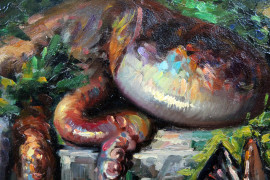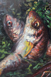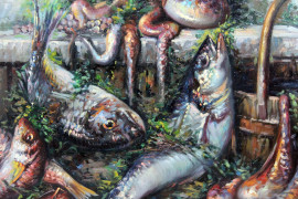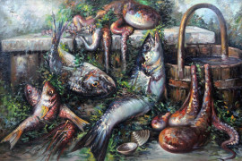 Natura morta con pesci, olio su tela, cm 70x100, entro cornice.