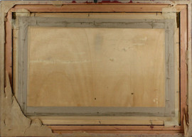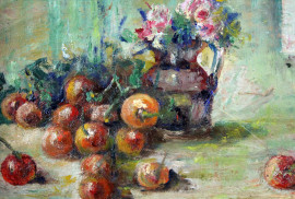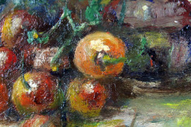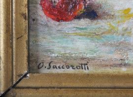 Natura morta-vaso con fiori e arance, olio su compensato, cm 19x27, firmato, entro cornice
