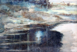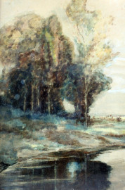 Paesaggio fluviale, acquarello su carta, cm 24,5x15,5, XX secolo, entro cornice