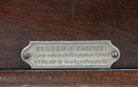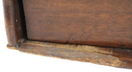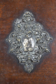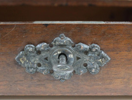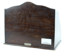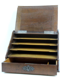 Portalettere da scrivania in noce con cassetto ed uno sportellino alzabile, particolari in metallo argentato, inizi XX secolo, cm h 27,5x34x26, (difetti)