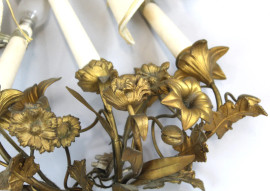 Quattro appliques in metallo dorato a tre luci, decori a fiori e foglie, altezza cm 40