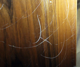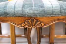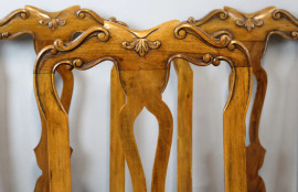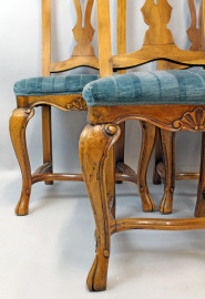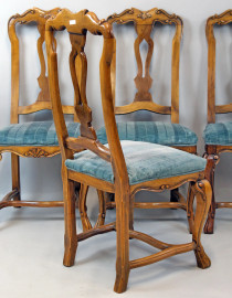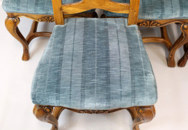 Quattro sedie in noce stile '700, schienali a giorno, sedute imbottite e rivestite in velluto, gambe mosse riunite da crociera, cm h 102