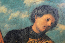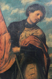 Sant'Alessandro, stampa a colori da Girolamo Romanino, cm 98,5x39, XX secolo, entro cornice, (difetti).