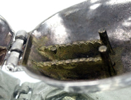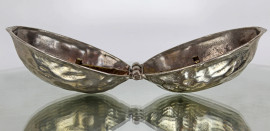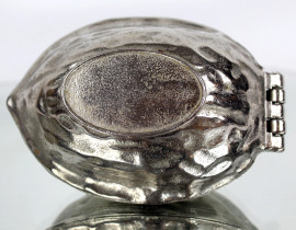 Schiaccianoci in metallo argentato a forma di noce, cm 7x12,5x8,5, XX secolo