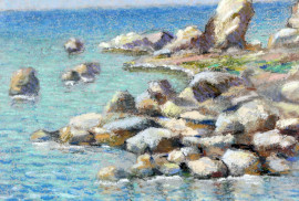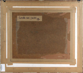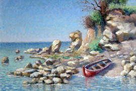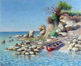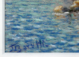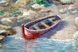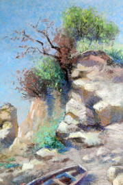 Scorcio di costa con barca, pastello su cartoncino, cm 37,5x46, firmato Baruffi, entro cornice