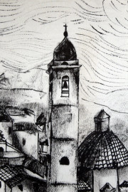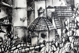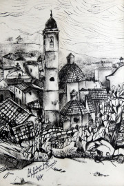 Scorcio di paese, multiplo su carta, cm 49x34, entro cornice
