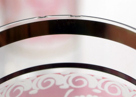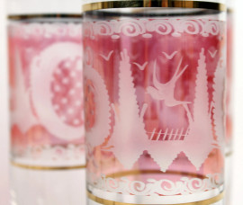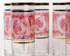 Servizio di sei bicchieri in cristallo molato, decori rosso rubino, finiture dorate, seconda metà XX secolo, (difetto)