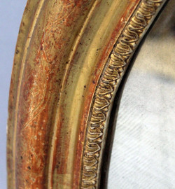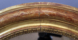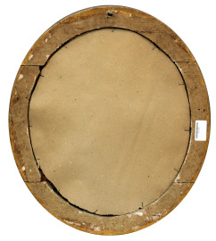 Specchiera di linea ovale in legno dorato con decori incisi, cm 65x58, XIX secolo