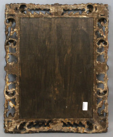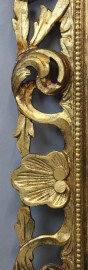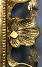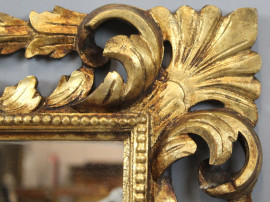 Specchiera di linea rettangolare in legno intagliato e dorato, cornice scolpita a volute e conchiglie, ingombro cm 91x72, luce cm 69x49, XX secolo