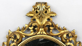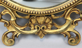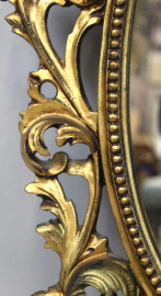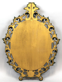 Specchiera in legno intagliato e dorato, di gusto rocaille, impianto ovale con con bordo perlinato percorso da volute traforate, cm h 82x60