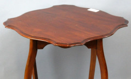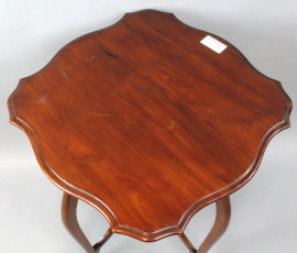 Tavolino da centro in noce, XX secolo, piano di linea sagomata, quattro gambe ricurve riunite da pianetto, cm h 70x53x53, (segni del tempo)