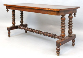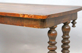 Tavolo basso in noce, inizi XX secolo, gambe tornite riunite da traversa, cm h 46,5x90x44,5, (difetti)
