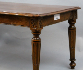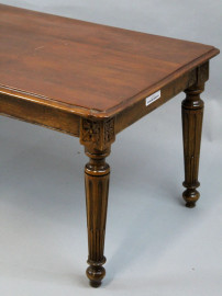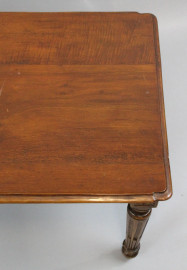 Tavolo basso in noce, inizi XX secolo, piano modanato poggiante su quattro gambe rastremate, particolari intagliati, cm h 42x98x48