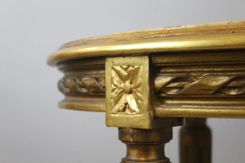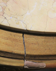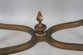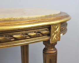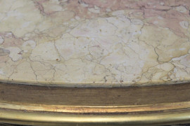 Tavolo da centro in legno intagliato e dorato con piano in marmo giallo di Siena, gambe scanalate legate da crociata, cm h 82x85x59, XX secolo, (difetti).