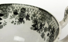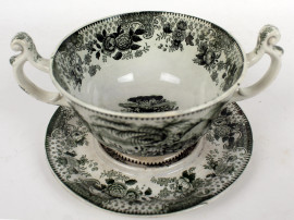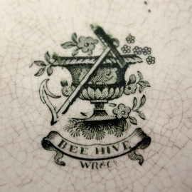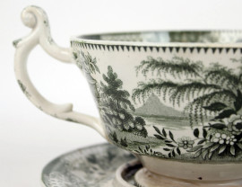 Tazza biansata in maiolica, decori in monocromia verde raffiguranti paesaggio con alveare, William Ridgway & Co, serie "Bee Hive", prima metà XIX secolo
