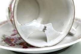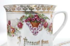 Tazza con piattino in porcellana bianca con decori floreali policromi, misure tazzina cm 8x11, diametro piattino cm 16, fine XIX-XX secolo