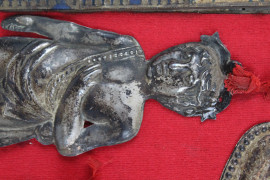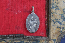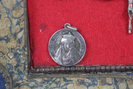 Teca contenente otto ex-voto ed una reliquia, cm 47x38, XIX secolo, (difetti)